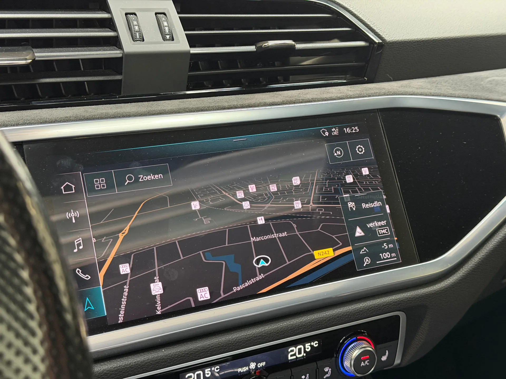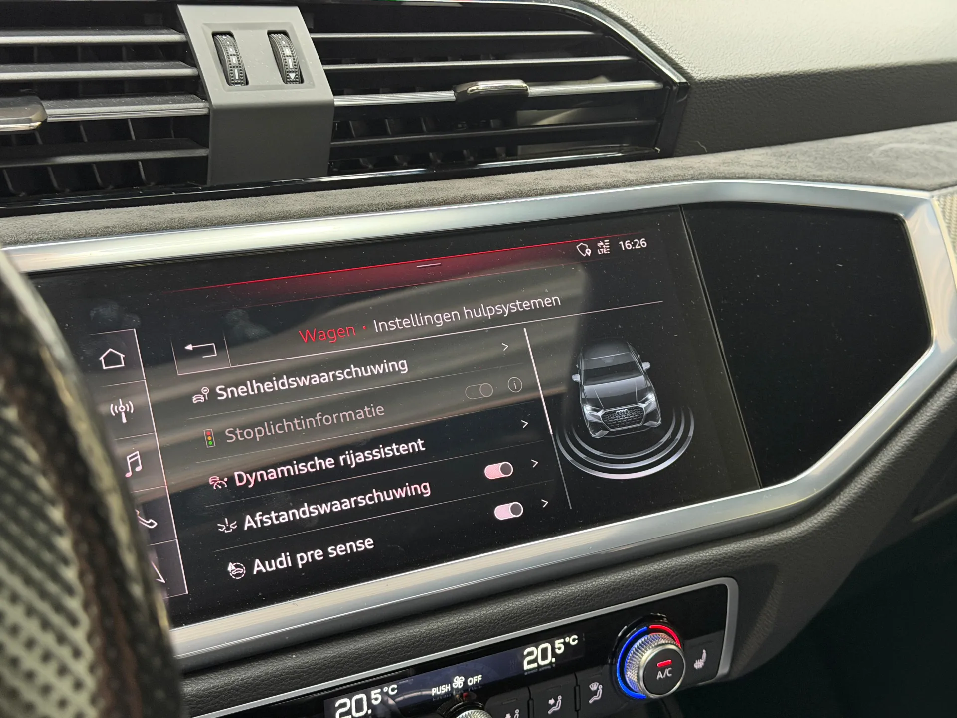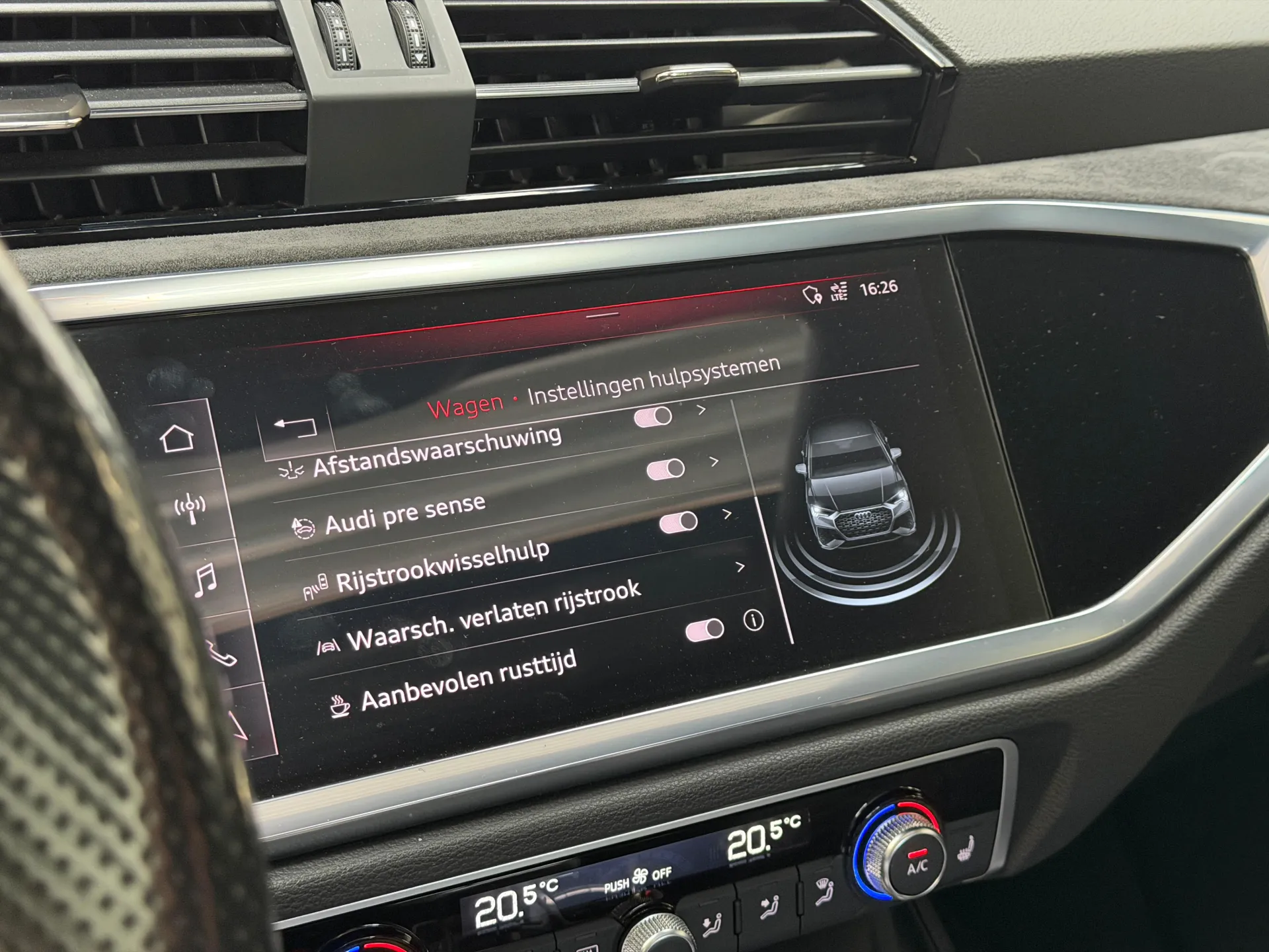 Zoals u mag verwachten van deze Audi Q3 Sportback is hij uitgerust met een reeks aan actieve veiligheidssystemen. Onderweg zorgt verkeersborddetectie ervoor dat u geen waarschuwingsbord mist. Het Lane-keeping systeem zorgt voor een automatisch constante positie binnen de rijstrook. Afdwalen is uitgesloten. Het forward collision warning-systeem berekent via een sensor de afstand tot het verkeer vóór u en komt in actie als er gevaar bestaat van een botsing. U bent mede dankzij dodehoekdetectie, accident avoidance system, hill hold functie, frontale botsbescherming en bandenspanningcontrolesysteem steeds veilig onderweg.